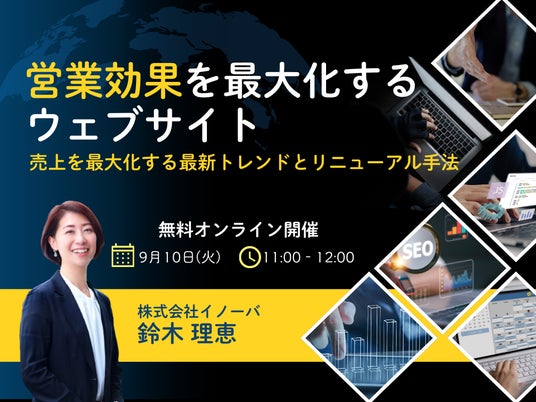 株式会社イノーバ(東京都新宿区、代表取締役:宗像 淳)は、「営業効果を最大化するウェブサイト~売上を最大化する最新トレンドとリニューアル手法~」と題した無料ウェビナーを9月10日(火)11:00~12:00はLIVE配信、9月11日(水)-12日(木)11:00~12:00は録画配信にて開催いたします。