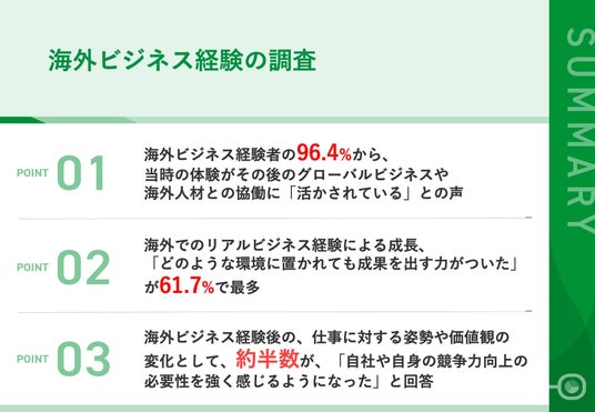 - 01|海外ビジネス経験者の96.4%から、当時の体験がその後のグローバルビジネスや海外人材との協働に「活かされている」との声