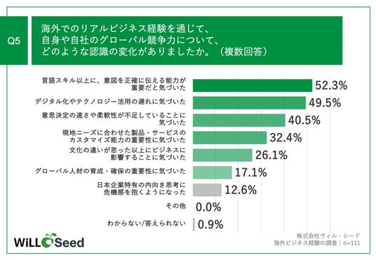 「Q5.海外でのリアルビジネス経験を通じて、自身や自社のグローバル競争力について、どのような認識の変化がありましたか。(複数回答)」(n=111)と質問したところ、