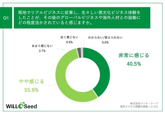 「Q1.海外トレーニーや海外出張、海外越境ビジネス研修にて、一定期間、現地でリアルビジネスに従事し、生々しい異文化ビジネス体験をしたことが、その後のグローバルビジネスや海外人材との協働にどの程度活かされていると感じますか。」(n=111)と質問したところ、