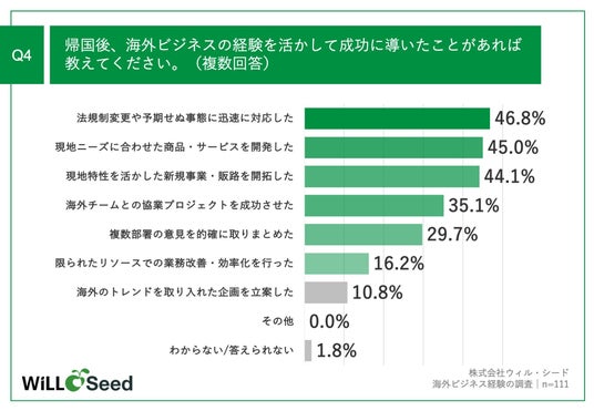 「Q4.帰国後、海外ビジネスの経験を活かして成功に導いたことがあれば教えてください。(複数回答)」(n=111)と質問したところ、