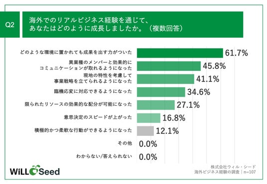 「Q2.海外でのリアルビジネス経験を通じて、あなたはどのように成長しましたか。(複数回答)」(n=107)と質問したところ、