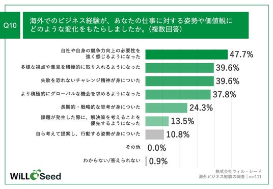 「Q10.海外でのビジネス経験が、あなたの仕事に対する姿勢や価値観にどのような変化をもたらしましたか。(複数回答)」(n=111)と質問したところ、