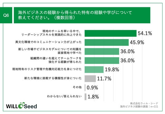 「Q6.海外ビジネスの経験から得られた特有の経験や学びについて教えてください。(複数回答)」(n=111)と質問したところ、