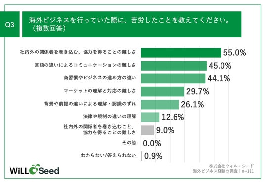 「社内外の関係者を巻き込む、協力を得ることの難しさ」が55.0%、「言語の違いによるコミュニケーションの難しさ」が45.0%、「商習慣やビジネスの進め方の違い」が44.1%という回答となりました。