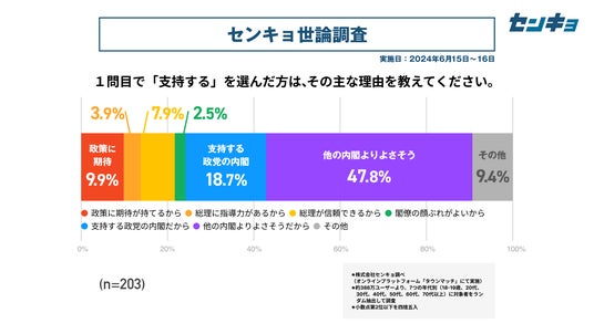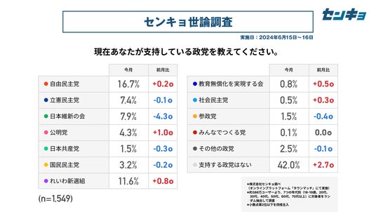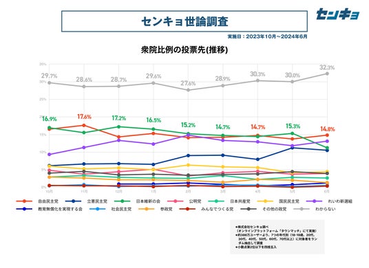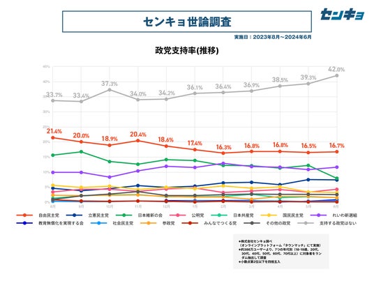 株式会社センキョ(所在地:東京都港区、代表取締役:堀 浩之)は、2023年8月より毎月、自社で運営する全国386万人余りの市民が参加するプラットフォーム「タウンマッチ」において、内閣の支持率や政党の支持率などを調査する「世論調査」を実施しています。政治に関する新たな調査データとして、政治関係者や有識者だけではなく、幅広く多くの方にご活用いただけますと幸いです。