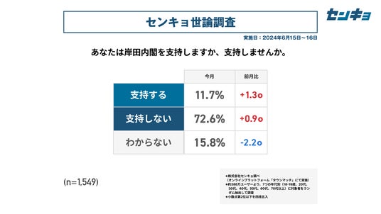 株式会社センキョ支持率は前月比1.3ポイント増、不支持率は前月比0.9ポイント増の72.6%