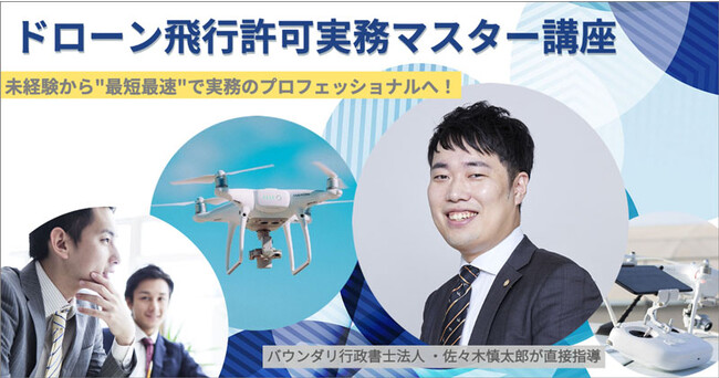 そこでドローン関連の許認可申請で実績を誇り、多数のドローン事業者の法務顧問を担うバウンダリ行政書士法人の代表行政書士・佐々木慎太郎が、行政書士向けの特別講座「ドローン飛行許可実務マスター講座」を開講いたします。