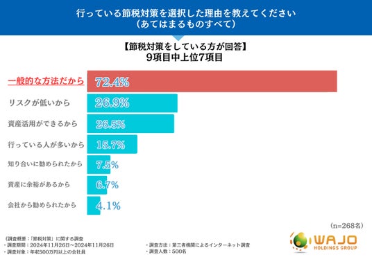 「一般的な方法だから(72.4%)」が多く、「リスクが低いから(26.9%)」「資産活用ができるから(26.5%)」「行っている人が多いから(15.7%)」「知り合いに勧められたから(7.5%)」と続きました。