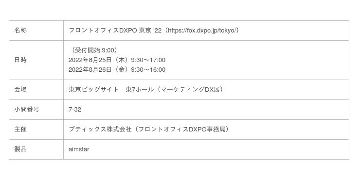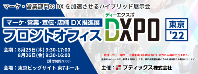 スプリームシステム株式会社(本社:東京都豊島区、代表取締役:佐久間 卓哉)は、2022年8月25日(木)・8月26日(金)に東京ビッグサイトで開催するMAツールやWEB解析、コンテンツマーケティングなど、マーケターが見込客獲得・育成のために検討したいツールやサービス展示会『フロントオフィスDXPOマーケティングDX展』に出展いたしますので、以下のとおりご案内申し上げます。