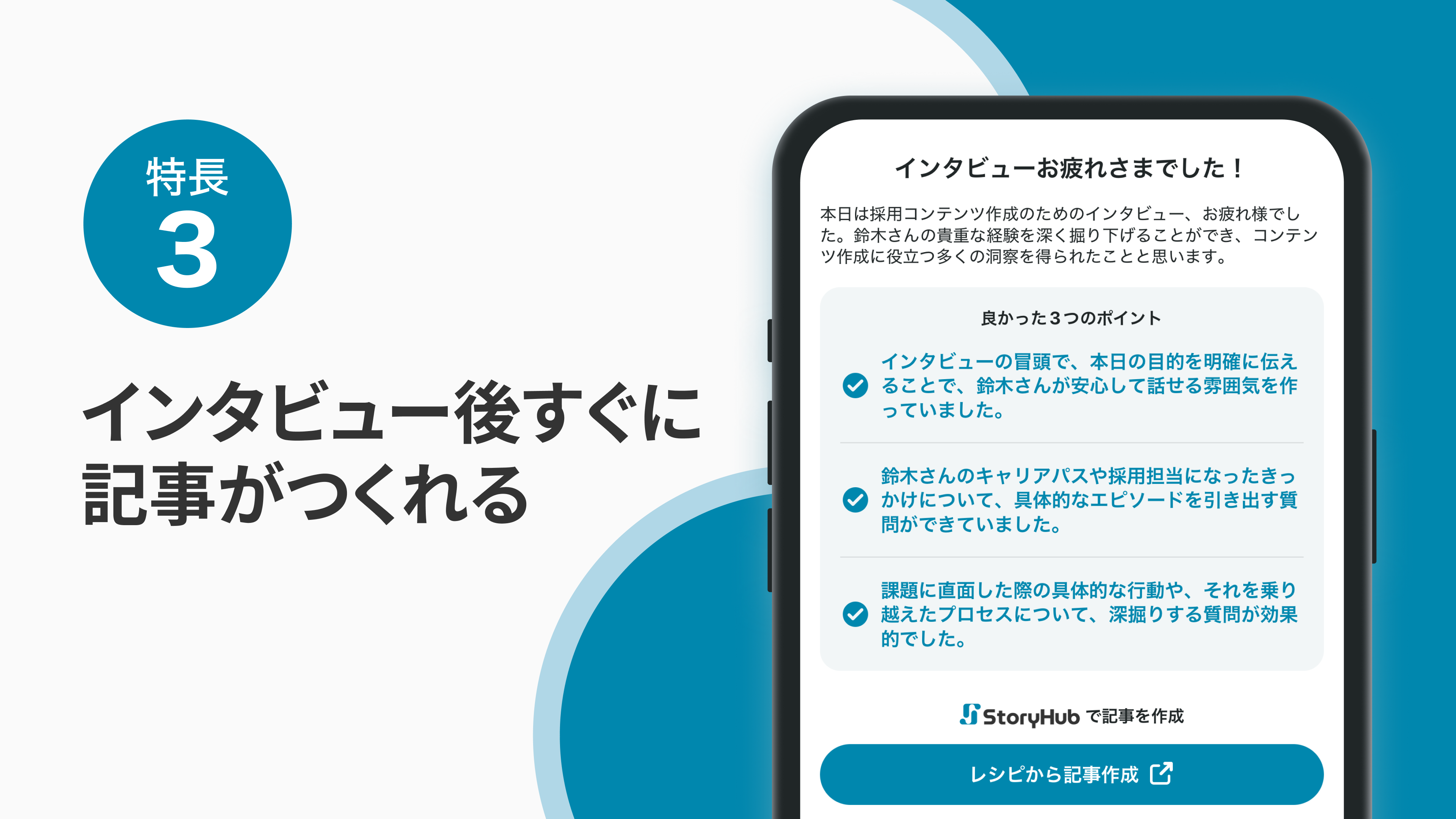 「StoryHubインタビュー」アプリ(β版)の主な特長は以下の3点です。