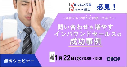 株式会社グロップ(本社:岡山県岡山市中区、代表:原田 竜一郎)は、インバウンドセールスの Web セミナーを 1月 22 日(水)に開催します。新規獲得に割ける人手・時間が不足している状況下で BtoB の営業活動に取り組み、問い合わせ件数の増加に成功した自社事例を紹介します。参加申請は Web で受け付けています。