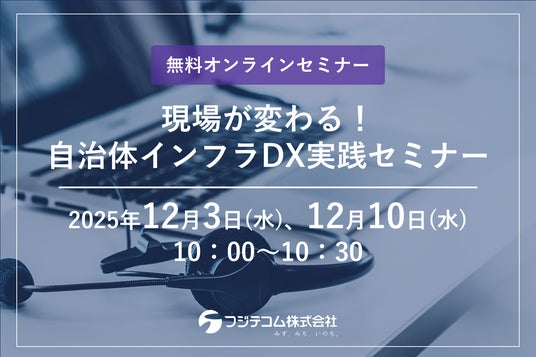 フジテコム株式会社(本社:東京都千代田区、代表取締役:森山 慎一、以下:フジテコム)は、事業体の皆さまを対象としたオンラインセミナー「現場が変わる!自治体インフラDX実践セミナー」を2025年12月3日(水)・10日(水)に開催いたします。