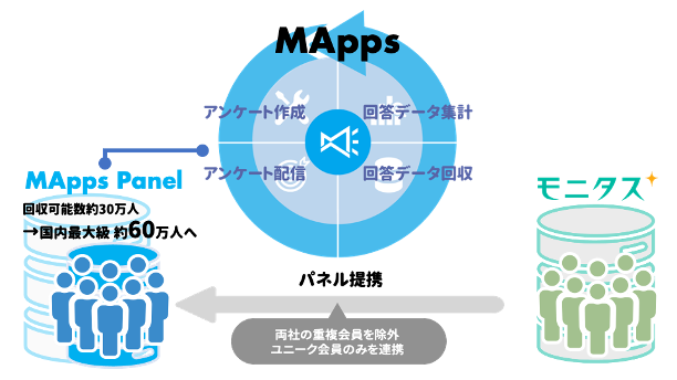 モニタスが運営するモニタスアンケートモニターとマップス社の提供する「MApps forSurvey」と「サーベロイド」アンケートシステムとアンケートモニターの連携により、国内最大級のアンケート実施環境を提供開始致します。モニタスモニター連携後の「MApps forSurvey」・「サーベロイド」アンケート実施時回答数は全国で最大約60万名規模となり、国内最大級のアンケート回答数の環境となります。