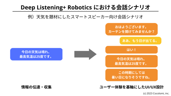 Deep Listening+ Robotics (ディープリスニング・ロボティクス) は、こころみが、2017年より提供する、ロボット・スマートスピーカー・チャットボット向けの会話シナリオ開発ソリューションです。こころみが、2014年より開始した高齢者向け会話型見守りサービス「つながりプラス」と2015年より提供する自分史作成サービス「親の雑誌」を通じて800人以上の高齢者との定期的・長期的な世間話で得られた会話データと知見をもとに、演劇的方法論と開発経験に基づく作成ノウハウを加え、信頼関係構築と情緒の満足に最適化された会話シナリオを作成します。情報の伝達・収集だけではなく、ユーザーの承認欲求に軸足をおいたユーザー体験を基に、会話シナリオとUI/UXを設計します。