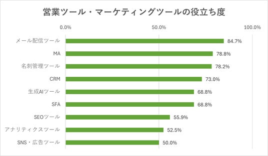 - メール配信ツールでは8割強がツールの役立ちを実感、MAツール、名刺管理ツールでは8割弱