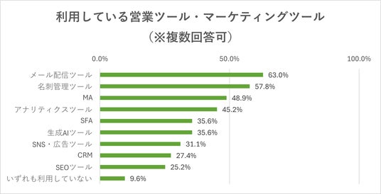 今回調査にご協力いただいた135社のうち、いずれのツールも利用していない企業は9.6%に留まり、約9割の企業ではなんらかの営業ツール・マーケティングツールを利用していることがわかりました。