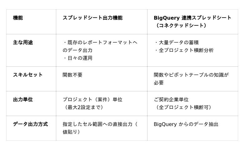 お客様自身で設定でき手軽さを重視した新しい「スプレッドシート出力機能」と、従来からご好評いただいている大量データの蓄積・分析に適した「BigQuery 連携(コネクテッドシート) によるスプレッドシート出力」の2つのソリューションから、お客様の求めるニーズに合わせてご利用いただけます。