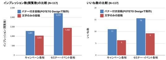 また、SNS上のデータ分析では、POTETO Designで制作したバナーを活用した投稿が、文字のみの投稿に比べ、多くのインプレッション(閲覧数)やいいね数を獲得していることが確認されました。