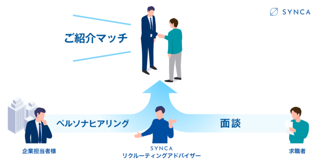 このたび、SYNCAに「候補者紹介マッチング」の新サービスを追加しました。SYNCAの利用企業が、リクルーティングアドバイザーに候補者のペルソナを伝えるだけで、アドバイザーが面談済みの候補者をご紹介するサービスです。スカウトメールを送ることなく、候補者との面談を設定することが可能となります。