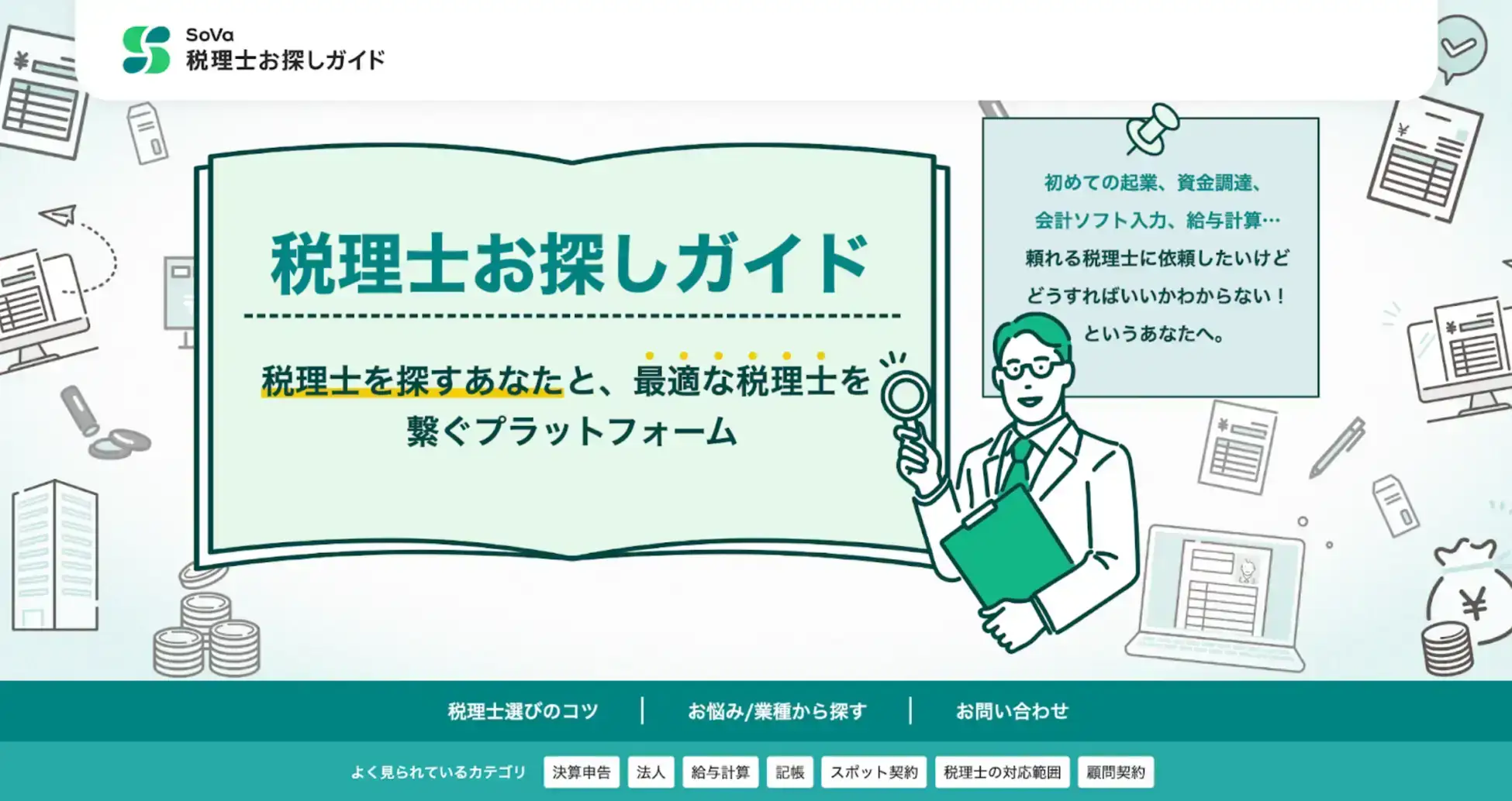 「SoVa」は、月額29,800円~で、役所手続きの代行から記帳代行・給与計算、経営者へのアドバイスまでをワンストップで提供する、新しいかたちの会計事務所です。