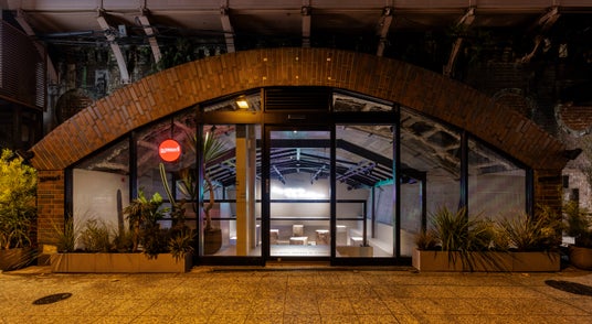 丸の内・有楽町エリアにある当施設は、街のアイコンの一つである線路高架下のレンガアーチのファサード、鉄骨とコンクリートで強固に作られた異質な空間の中に、草木や鉄、江戸城にも使われてきた本小松石などの自然素材のテクスチャーを活かした非日常を演出しています。