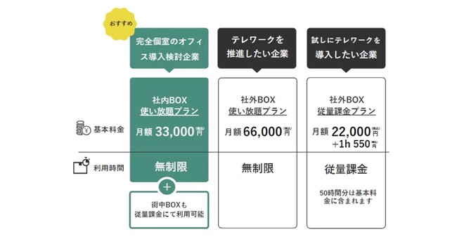 RemoteworkBOXの法人向けプラン「RemoteworkBOX Biz」は、首都圏を中心に全国に設置されているRemoteworkBOXを法人単位で利用できるプランです。プランは大きく3つあり、「定額プラン」「50時間分利用可能の従量プラン」「自社設置BOXの定額プラン」となっております。「RemoteworkBOX Biz」は、1つのライセンスを複数の従業員の方で共有し、利便性の高い集中個室空間を提供することで、外出先でのオンライン会議も情報漏えいの心配をすることなく実施してもらうことが可能です。低コストで高い利便性を両立しています。