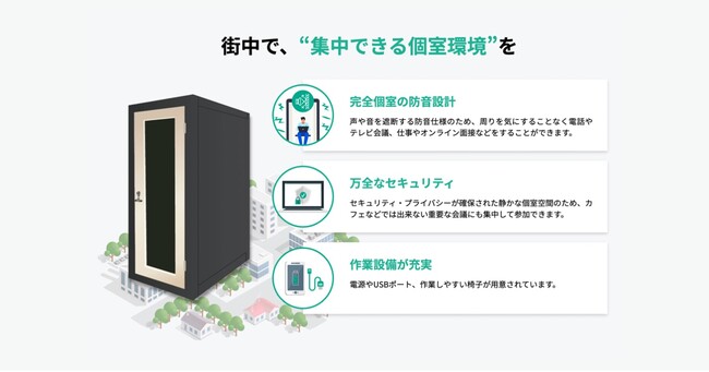 「街中にあなただけの、集中個室空間を」をコンセプトにした、Wi-Fi・電源が完備された完全個室型作業スペースです。スマホ1つで、全国350台設置されている「RemoteworkBOX」を、15分単位でご利用いただけます。