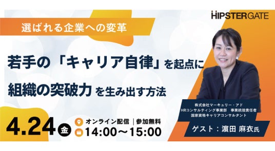 株式会社マーキュリー・アド(本社:大阪市北区、代表取締役:徳山 敬祐、以下「当社」)は、2026年4月24日(金)に、株式会社HR dock(本社:東京都品川区)と株式会社ヒップスターゲート(本社:東京都港区)が共催するオンラインセミナー『選ばれる企業への変革 ― 若手の「キャリア自律」を起点に組織の突破力を生み出す方法』に、当社HRコンサルティング事業部 事業統括責任者の濱田麻衣が登壇することをお知らせいたします。