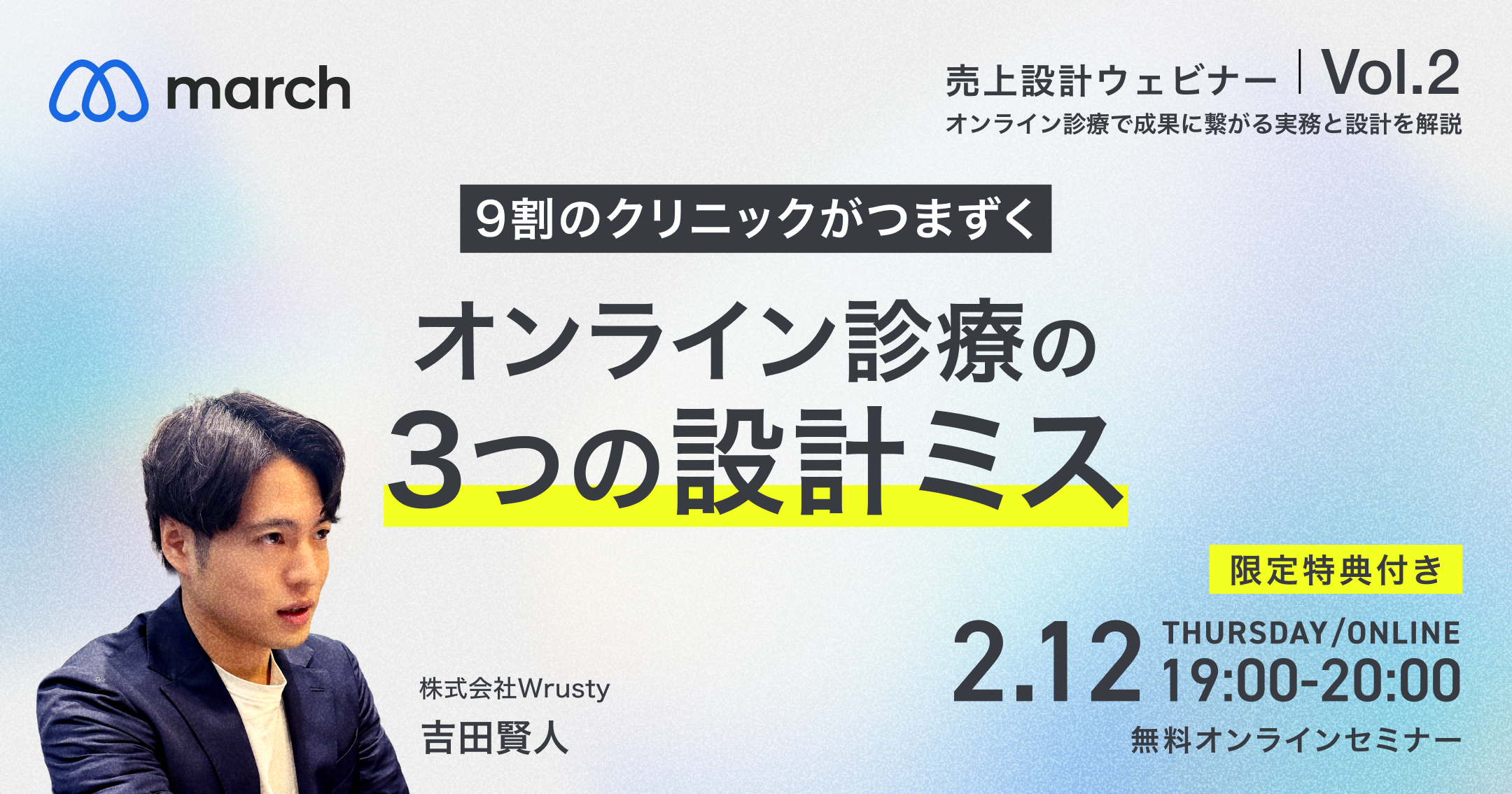 LINEを活用した集患と継続収益まで自動化することで、医療機関の “成果に責任を持つ” オンライン診療・集患オペレーションシステム「march」を展開する株式会社Wrusty(本社:東京都渋谷区、代表取締役:上田遼)は、全国の開業医・開業予定医の皆様を対象に、無料オンラインセミナー「9割のクリニックがつまずく3つの設計ミス」を2026年2月12日に開催いたします。本セミナーでは、多くの医療機関がオンライン診療を導入したものの、なぜ収益化させることができないか、対して、なぜ「march」を活用している医療機関は1年間で9倍という収益に繋げることができているかを、再現性の高い設計という観点から解説します。9割のクリニックがつまずく3つの設計ミス