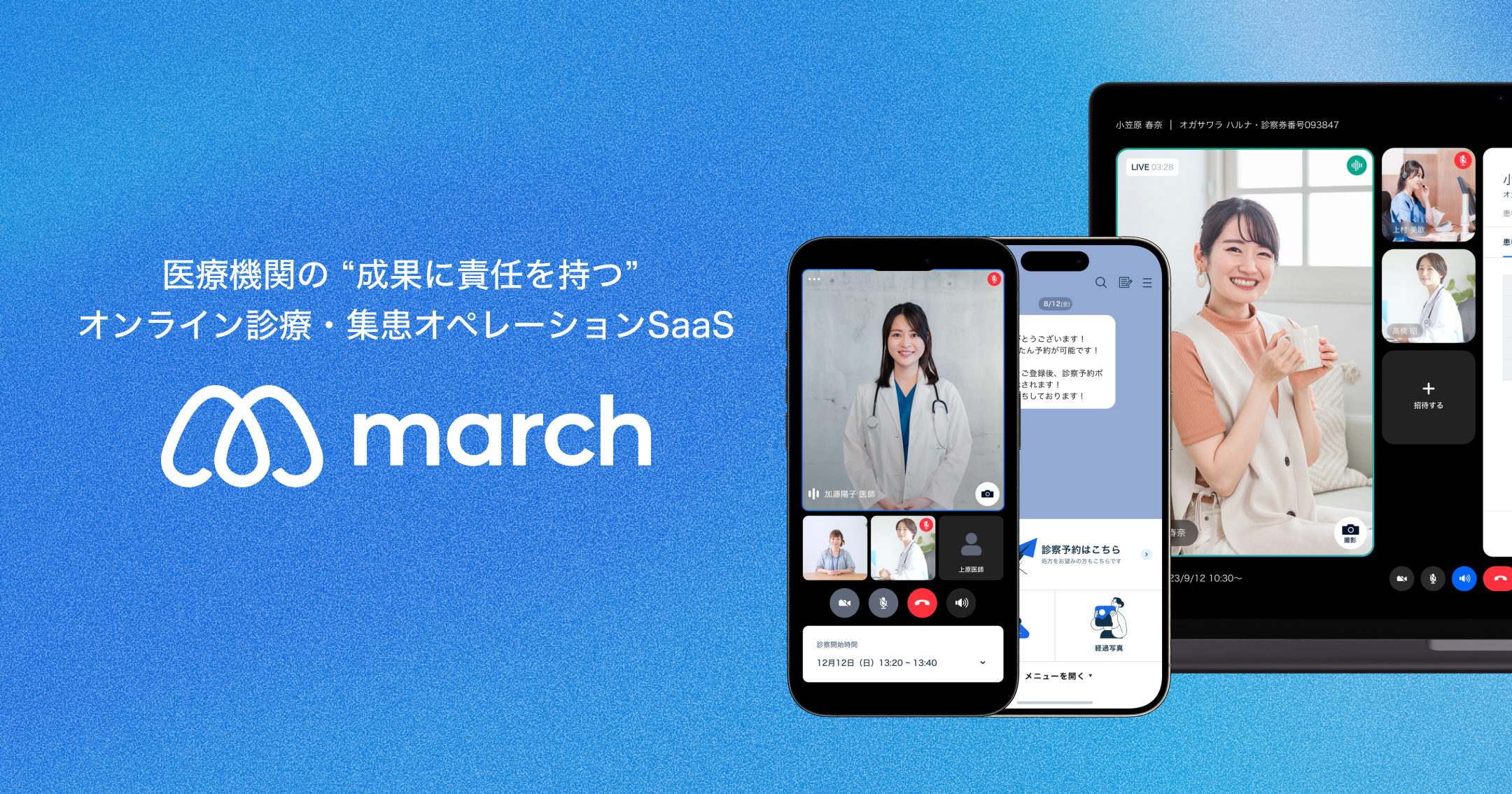 医療機関の “成果に責任を持つ” オンライン診療・集患オペレーションシステム「march」は、医療機関と患者の双方にやさしいオンライン診療の実現を目指し、
