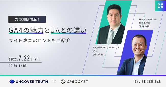CRO(コンバージョンレート最適化)のためのプラットフォームを提供する株式会社Sprocket(本社:東京都目黒区、代表取締役:深田 浩嗣)は、株式会社UNCOVER TRUTH CAOの小川 卓 氏をお招きし、バージョンアップの対応期限間が迫るGA4の魅力とUAとの違いに関するセミナーを2022年7月22日に開催いたします。