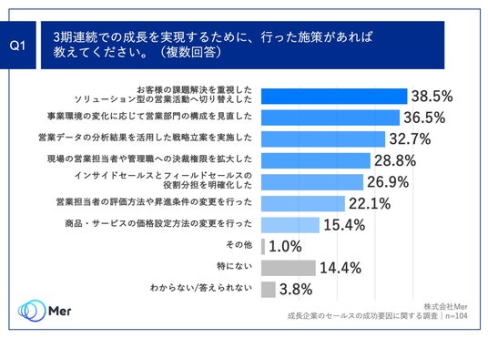 「Q1.3期連続での成長を実現するために、行った施策があれば教えてください。(複数回答)」(n=104)と質問したところ、