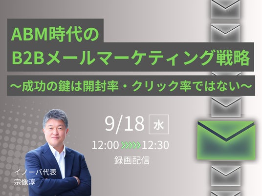 株式会社イノーバは(本社:東京都新宿区、代表取締役社長CEO:宗像淳、以下イノーバ)は、『ABM時代のB2Bメールマーケティング戦略~成功の鍵は開封率・クリック率ではない~』と題した無料ウェビナーを、2024年9月18日(水)12:00より開催いたします。本セミナーは、2024年8月に実施したセミナーの再放送です。多くのご要望にお応えし、再放送が決定いたしました。