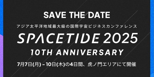 一般社団法人SPACETIDE(本社:東京都港区、代表:石田真康、以下「SPACETIDE」)は、2025年7月7日(月)~7月10日(木)の4日間、東京・虎ノ門エリアで10回目の国際宇宙ビジネスカンファレンス『SPACETIDE 2025』の開催を正式に決定いたしました。
