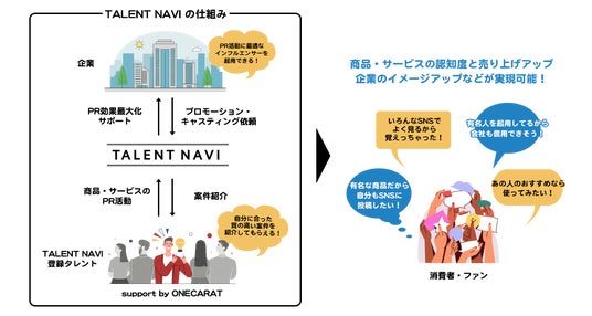 TALENT NAVI公式HPインフルエンサー支援の新たな一歩 ONECARATは所属ライバー数1万人以上の日本最大級のライブ配信者事務所として、多くのライブ配信者(ライバー)の成長と成功をサポートしてきました。今回の『TALENT NAVI』の成功により、ONECARATはその支援範囲をインフルエンサー全般に広げ、インフルエンサーが自身のSNSフォロワーを活用して収益を上げられる環境を目指していきます。