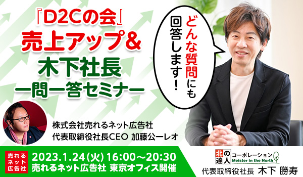 株式会社売れるネット広告社(本社:福岡市早良区、代表取締役社長CEO:加藤公一レオ、以下 売れるネット広告社)は、2023年1月24日(火)に売れるネット広告社 東京オフィスにて『D2Cの会』売上アップ&木下社長一問一答セミナーを開催いたします。株式会社北の達人コーポレーション 代表取締役社長 木下 勝寿様、そして株式会社売れるネット広告社 代表取締役社長CEO 加藤公一レオとの2社共催で、D2C(ネット通販)の売上アップについてや、参加者からの質問に対して木下社長より直々に回答いただきます。東京お台場での開催で、事前申込が必要です。