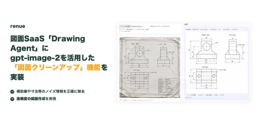 株式会社renue(本社:東京都港区、代表:山本悠介)は、2D図面から3Dモデルを自律生成するWebアプリケーション「Drawing Agent」に、OpenAIの画像生成モデル「gpt-image-2」を活用した新機能「図面クリーンアップ」を追加しました。補助線・寸法標注・ハッチング・引出線等のノイズを一括除去し、純粋な外形輪郭と材質境界線のみを抽出します。
