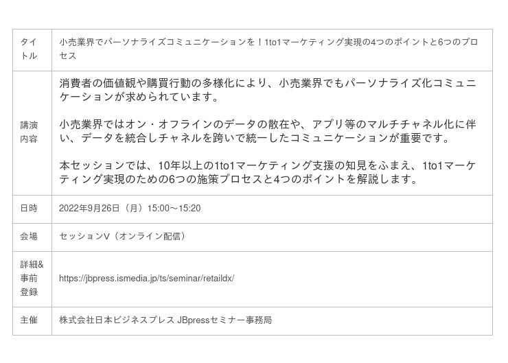 スプリームシステム株式会社(本社:東京都豊島区、代表取締役:佐久間 卓哉)は、2022年9月26日(月)より、株式会社日本ビジネスプレス JBpressセミナー事務局のオンラインセミナー「【第9回】リテールDXフォーラム」にて登壇致します。