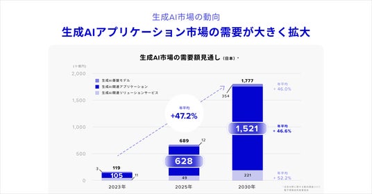 国内の生成AI市場は、年平均47.2%で成長し、2030年には1兆7,774億円に達する見込みです。この中で、特に生成AIアプリケーションの需要が大きく拡大すると期待されています(※)。