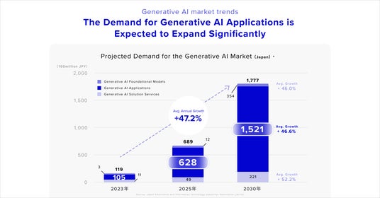 According to recent data, Japan’s generative AI market is projected to grow at an average annual rate of 47.2%, reaching 1.7774 trillion yen (approximately 12 billion USD) by 2030. Among the various AI-related fields, the demand for generative AI applications in particular is expected to expand significantly.