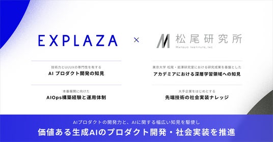 Tokyo, Japan (January 14, 2025) - EXPLAZA Inc. (Headquarters: Minato-ku, Tokyo; CEO: Kazuki Takahashi; hereinafter “EXPLAZA”) and Matsuo Institute Inc. (Headquarters: Bunkyo-ku, Tokyo; CEO: Takayoshi Kawakami; hereinafter “Matsuo Institute”) are pleased to announce that they have entered into a capital and business alliance. Through this alliance, the two companies aim to accelerate product development leveraging AI technology, thereby contributing to enhanced productivity and DX efforts in Japan.