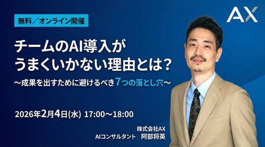 株式会社AX(本社:福岡県福岡市、代表取締役:石綿 文太)は、オンラインセミナー**「チームのAI導入がうまくいかない理由とは?~成果を出すために避けるべき7つの落とし穴~」**を2026年2月4日(水)に開催いたします。