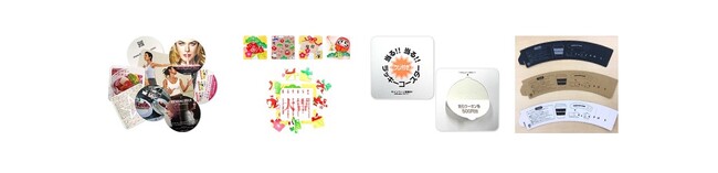 定番の紙製コースターをはじめ、遊び心のあるパズル型コースター、ワクワク感を味わえるクジ付きのスクラッチ型コースターなど、オリジナル性の高い販促物を取り扱っています。またコースター以外にも、熱い飲み物や冷たい飲み物を入れた紙コップに巻いて使うことができる販促物「カップスリーブ」も掲載しています。「カップスリーブ」は飲食店やイベント、セミナーなどのシーンでご活用いただけます。