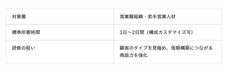 本プログラムでは、顧客の感情・価値観の違いを理解し、どんな相手にも信頼で応える営業スキルを身につけます。また、講師が演じる4タイプの顧客に対して、チームで戦略を立て受注を目指す「ロールプレイング型ワーク」を通じ、実践的かつ体感的に成果を出すための営業力を磨きます。