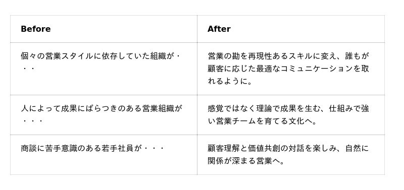 営業活動を「数字を追う仕事」から「人を理解し、心を動かす対話」へと変える実践型プログラムとして、提案を極めどんな顧客の信頼も勝ち取る強い営業チームへの変容を実現します。