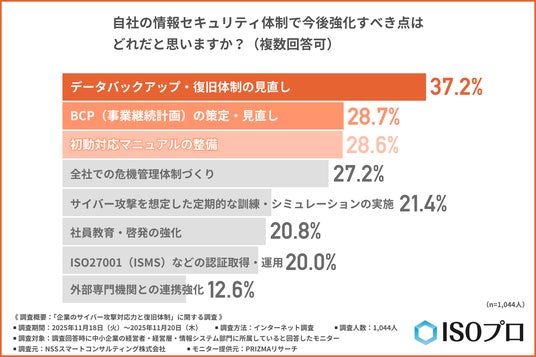 今後強化したい点として「データ復旧体制」「BCP(事業継続計画)の策定・見直し」「初動対応マニュアルの整備」など、被害後のリカバリーを重視する回答が上位に挙がりました。
