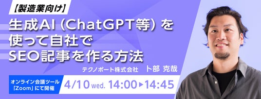 製造業向けのWebマーケティングサービスを提供する、テクノポート株式会社(本社:東京都港区、代表取締役:徳山 正康)は、製造業向けに、生成AI(ChatGPT等)を使って自社でSEO記事を作る方法を伝えるセミナーを開催します。 セミナーでは、デモンストレーションや具体的なプロンプトの紹介を行いながら生成AIの活用法を詳しく解説していきます。