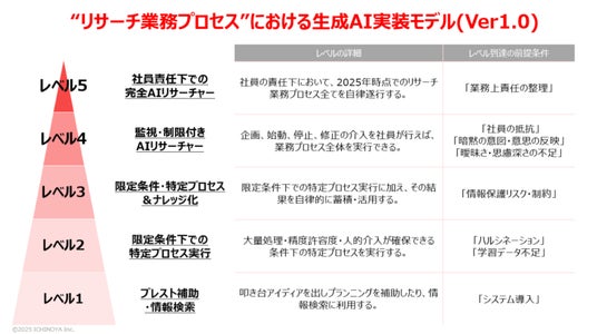 - リサーチ業務プロセスにおけるAI活用が進む中での近年の議論をもとに、「仮に、2025年現在企業社内で行われているリサーチ業務プロセスの全てが、AIによって自律的に遂行できるようになるという理想的な想定下での到達点」を最高レベルとして、企業への実装段階を5つに分けてモデル化しています。目標の状態を実現する過程では、それぞれのレベルにおける主要な課題を解消する必要があります。