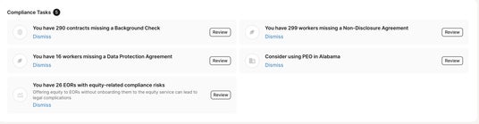 もしDeelのプラットフォームに従業員の人材情報をご入力いただきましたら、各国にいる従業員に紐付いた最新のコンプライアンス情報や確認必須事項などがCompliance Taskとして表示されます。